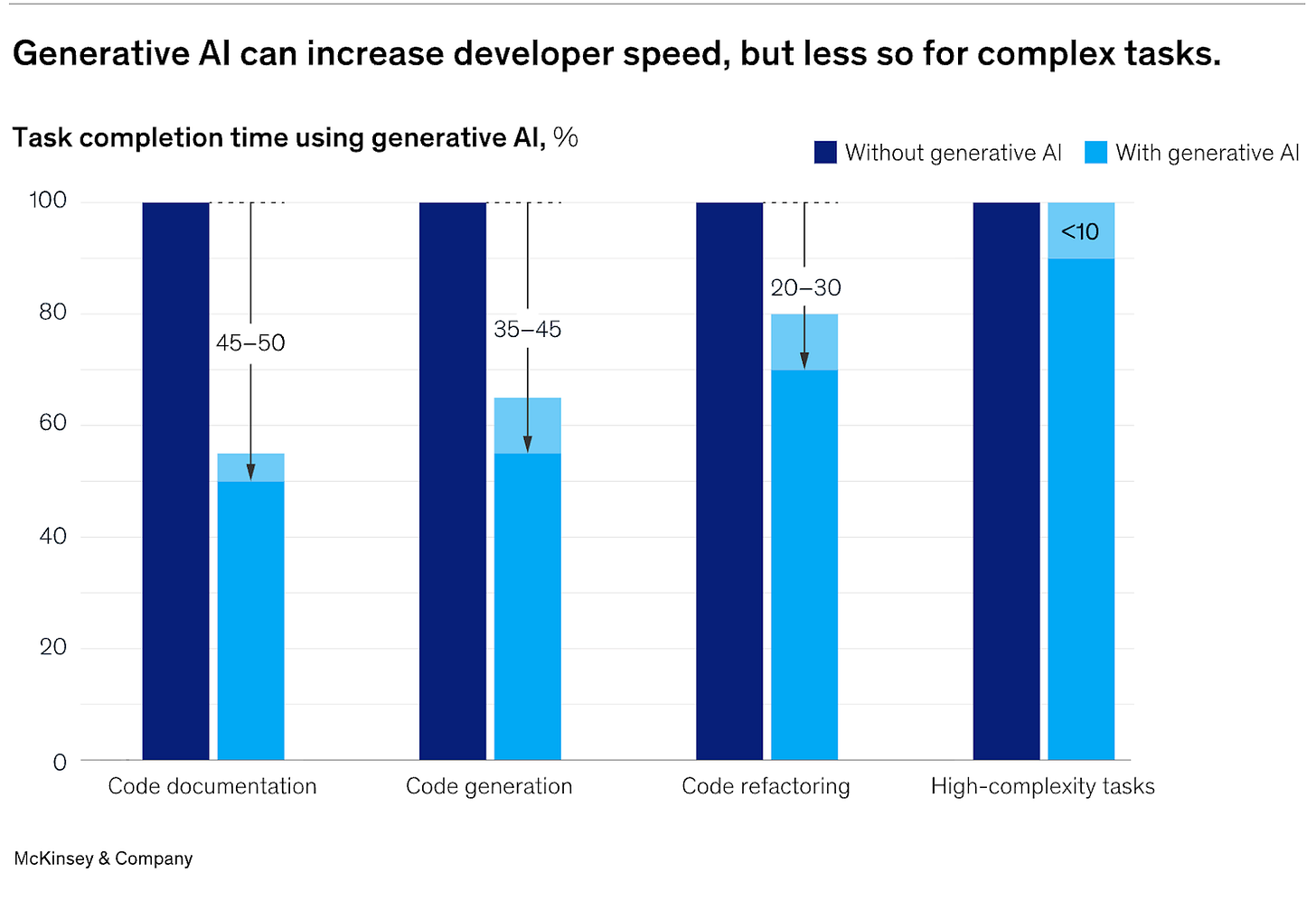 Meanwhile, gen-AI tooling already doubles speed on many developer tasks (code, docs, refactors) without hurting quality - an efficiency shock that cascades through config, test, and data work central to SI projects.