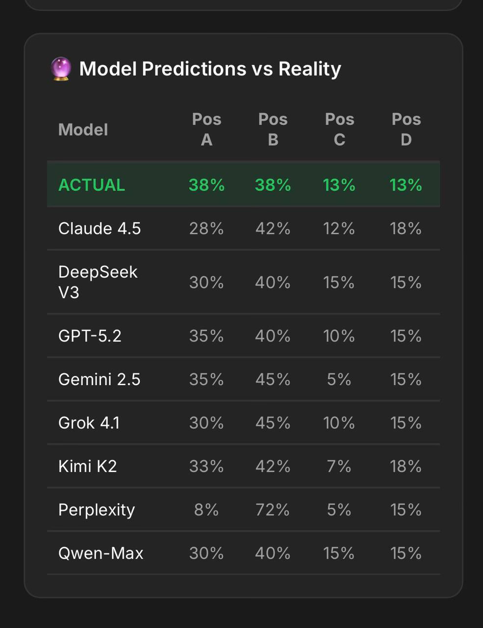 Here’s how it works: I give all eight models - Claude 4.5, GPT-5.2, Gemini 2.5, Grok 4.1, DeepSeek V3, Qwen-Max, Perplexity, and Kimi K2 - the same question. They each answer it. But here’s the twist: I also ask each model to predict what the others would answer.