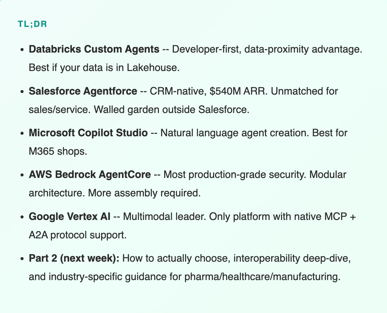 Databricks, Salesforce, Microsoft, AWS, and Google all launched enterprise agent frameworks in rapid succession. Here’s what each one actually does, from someone who deploys them in regulated environments.