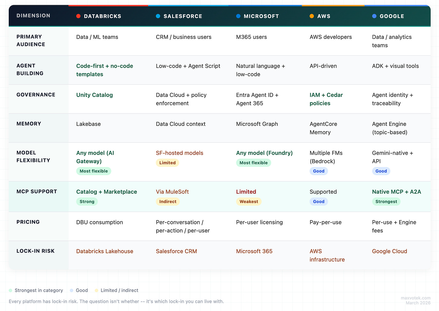 Google’s interoperability story is the most forward‑leaning. When your pharma manufacturing agent needs to communicate with your supply‑chain vendor’s agent, protocol standards matter. Google is betting on being the Switzerland of agent interoperability.