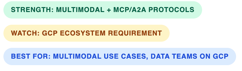 Google centers its agent platform on Vertex AI Agent Builder and its associated SDK. Two things stand out above everything else: multimodal capabilities and a strong bet on interoperability.