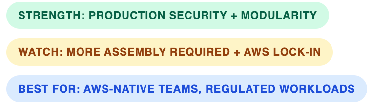AWS is the most “production‑grade primitives” option. If you need enterprise security, monitoring, and compliance at scale, AgentCore gives you granular control over how agents run, what they can touch, and how they’re audited.