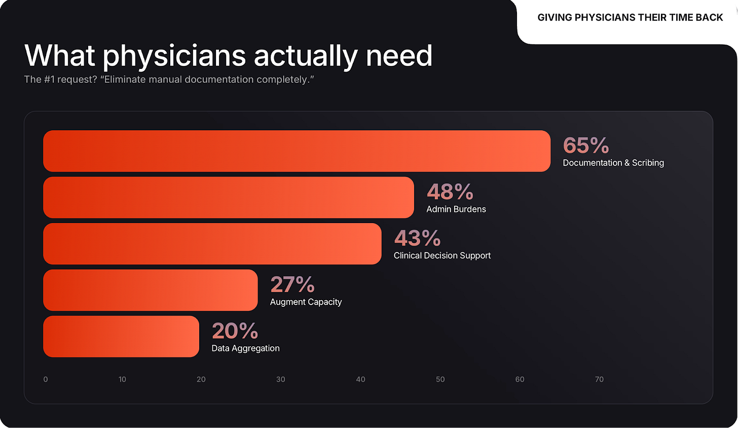 65% named documentation and administrative burden automation as their top priority. That’s one and a half times more important than clinical decision support (43%). The dream isn’t diagnostic AI or predictive analytics. The dream is “give me back the hours I lost to inbox management.”