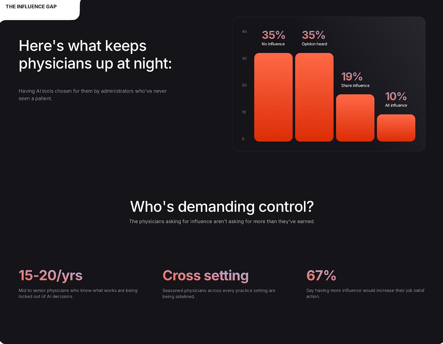 The issue isn’t adoption, physicians are already there. The issue is control. 71% of physicians report having little to no influence on which AI tools their organizations adopt. Nearly half say their employer’s communication about AI is poor. And 89% believe they should receive dedicated funding for AI tools (most want between $500-1000 annually, though some are asking for $10,000+).